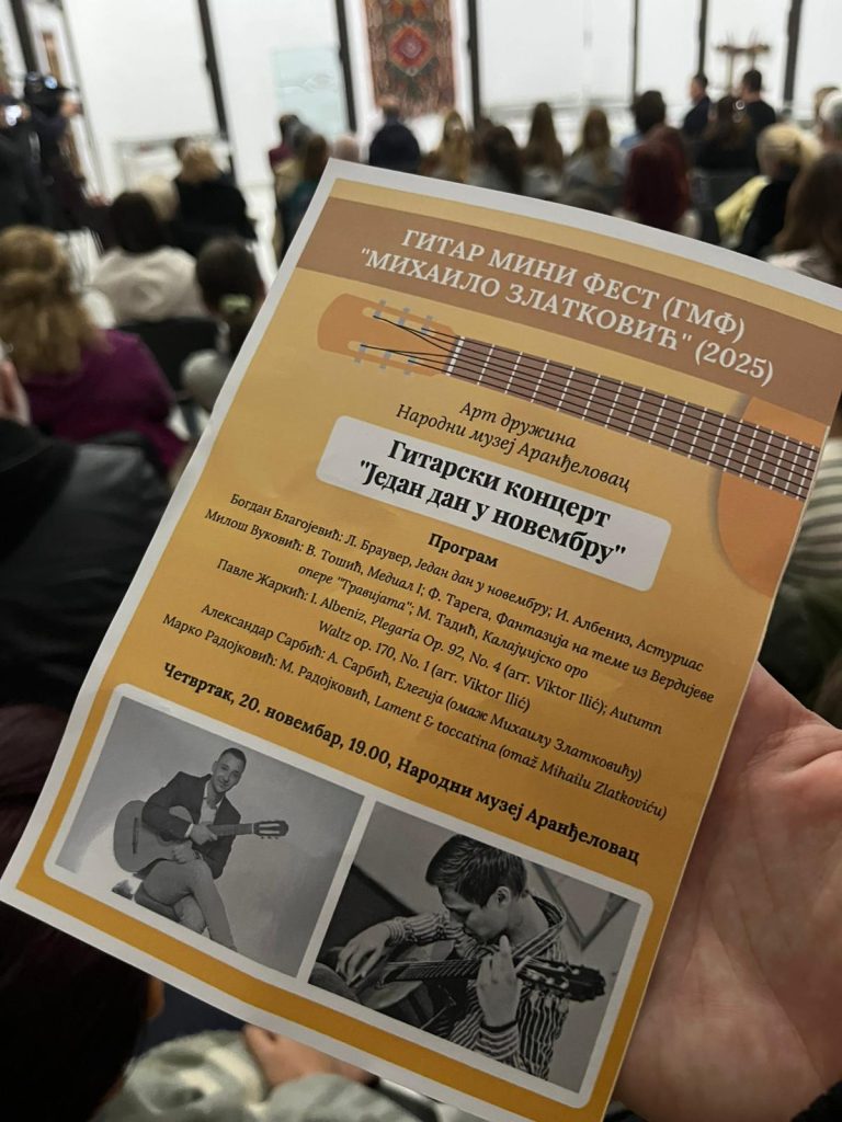 У оквиру програма Гитар мини феста (ГМФ) “Михаило Златковић“ (2025), у четвртак, 20. новембра, у 19:00, у Народном музеју у Аранђеловцу, одржан је гитарски концерт под симболичним називом “Један дан у новембру“. Пред многобројним посетиоцима и љубитељима класичне музике, свирали су млади уметници: Богдан Благојевић, Милош Вуковић, Павле Жаркић, Александар Сарбић и Марко Радојковић.